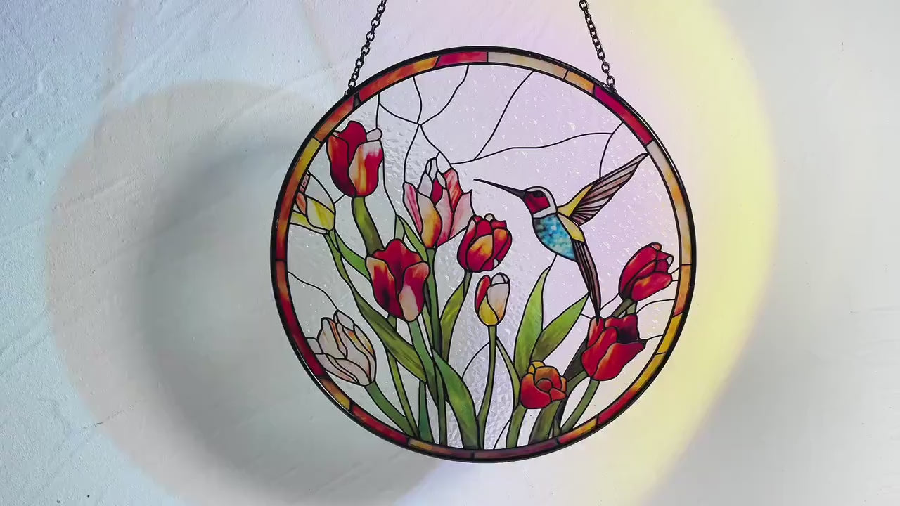 Hummingbird and Tulips Stained Glass Suncatcher/Window Hanging