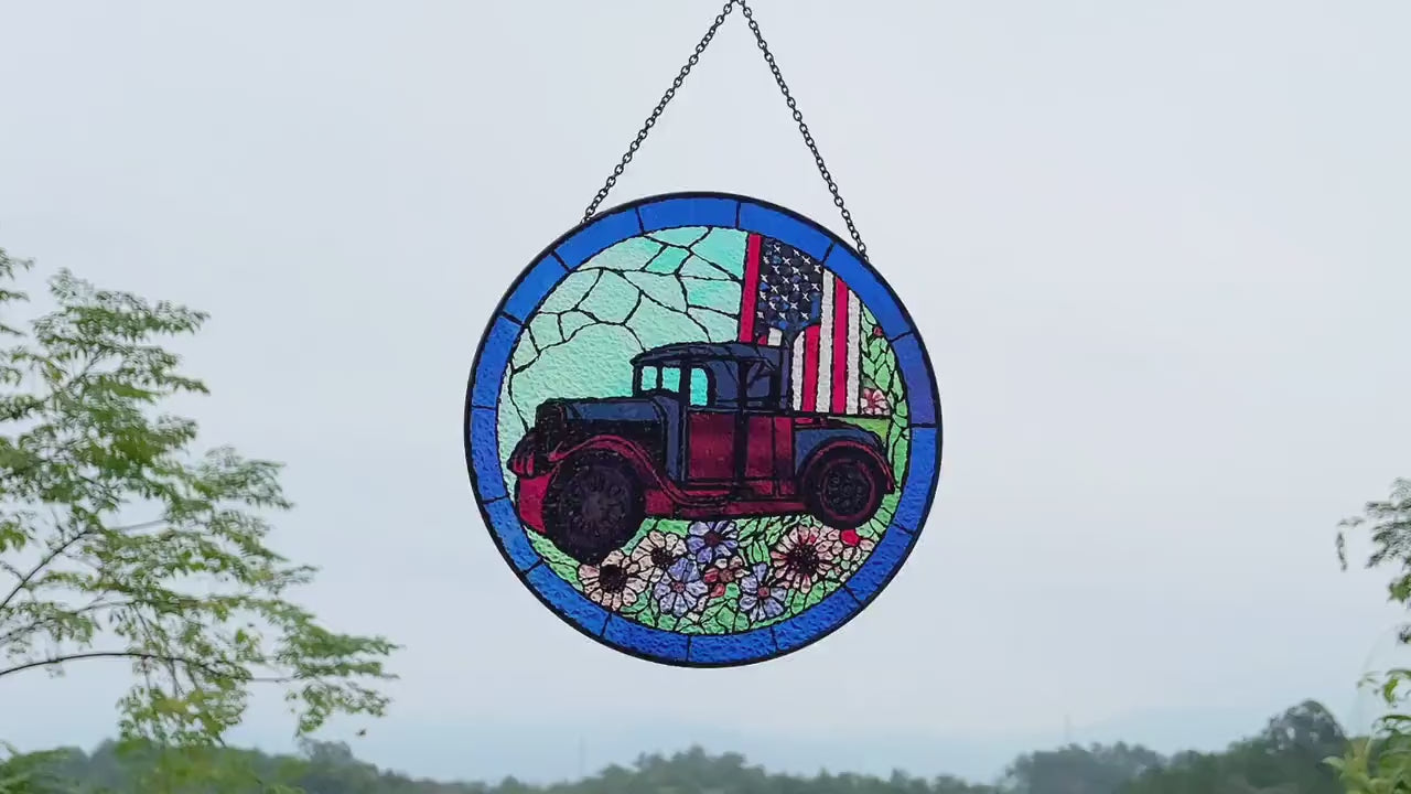 Sized at 7.8 * 7.8 inches, this captivating glass suncatcher effervesces with brilliance in the sunlight, adorned with a classic car and US flag in a kaleidoscope of hues. Every piece is meticulously hand-soldered and reinforced with zinc strips along the outer edge, ensuring its lasting strength. Thoughtfully, two secure hanging hooks are seamlessly incorporated at the top for effortless display.